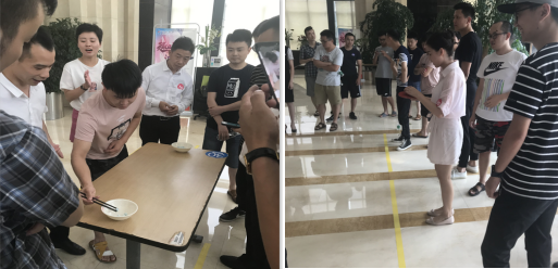 本次活动为积分赛,由三轮比赛组成。第一轮比赛是夹玻璃球,6个人一组,每个人需要从一个碗里夹3个玻璃球到另一个碗里,用时最短的组为第一名。听完规则之后大家都表示这个比赛挺简单的,开始比赛后才发现实际操作起来夹一个玻璃球都很困难,以至于第一轮比赛耗时最久。第二轮是比赛是乒乓球运球,规则是手拿乒乓球拍6人一组,球拍上放乒乓球以接力的形式运球比赛,完成时间长短排名次,比赛相对比较简单,很快就结束了第二轮的乒乓球比赛。最后一轮比赛是运气球,双人接力赛依旧每队6人,每队人员再分为三小组,两人背对背运送气球,3组人员接力完成运送气球,还是以用时最短的获胜。三轮比赛很快就结束了,分数依次排名计分。比赛完成后我们核算总分数,结果成绩出人意料,本以为最没有机会得奖的一组取得了第一名,没有获奖的参赛人员也领到了精美的礼品。