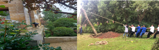 第二天一早,我将此情况及时上报给项目领导王经理,王经理一早赶到麓湖之春项目查看现场。9月14日公司品质部绿化负责人杨经理到我们麓湖之春项目协调后续事宜。经过沟通协调,绿化人员负责树木截枝,把倒塌的树木先扶正,再进行养护。客服部联系私家花园有树木倒塌的业主,告知业主此事件,我们需要截树枝将树扶正再养护,希望得到业主支持。工程部负责对损坏的墙面、阳台等位置进行修复。项目所有人员全力协助绿化部的工作,尽快完成我们园区的修复。我们找来滑轮等工具,通过我们自己人员的齐心协力,终于把所有倒塌的树木恢复完成。通过品质部杨经理的现场指导,项目所有人员的紧密配合,一周内就完成了我们园区的修复。此次任务的完成体现了公司对我们的支持,我们项目各部门之间的密切配合。团结就是力量,我们的工作得到了业主的肯定和赞扬。