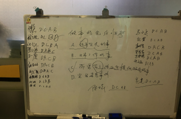 十分钟后,大家回到培训教室。我先说了这道题不作为考核题计分,只是一种测试。我们凯旋广场优秀的秩序队员们都是(D)答案开头,这说明大家都具备大局观。选择(DCAB)的占绝大多数,属于在工作中做事有条理、有分寸的人;选择(DACB)的同事是情商较高的类型。每个人都对号入座,让大家意识到自己的优劣势,相互取长补短是我出这道题的初衷。