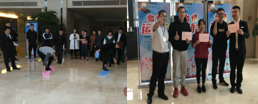 活动当天由于一直在下毛毛细雨,我们只好在室内举办。天公虽然不作美,但是一点也不影响大家参与活动的热情。下午两点我们准时开始活动,我们一共分为六个小组,每队六人。第一轮比赛摸石过河,运动员们以接力方式进行,我们给每组队员发三块泡沫砖,参赛队员站于起跑线后,用第1、2块泡沫砖放于地上,手拿第3块泡沫砖。比赛开始后,运动员们将泡沫砖踩在脚下,用第三块泡沫砖交替前行,中途脚不能着地,到达指定地点再把三块泡沫砖给队友接力前行。紧接着进行第二轮比赛,第二轮比赛是气球运纸杯,运动员们同样以接力的形式比赛,以完成时间排名次。最后一轮比赛是穿越呼啦圈,每队运动员们手拉手站成一排,由右边第一人手持呼啦圈,保持每名队员之间不松手的前提下将呼啦圈穿过整个队伍,直到呼啦圈穿过所有队员后结束。三轮比赛很快就结束了,成绩出人意料,本以为最没有机会得奖的一组取得了第一名,反而最有信心夺冠的组取得了第三名。得到名次的运动员们领到了奖金,没有获奖的运动员们我们也为他们准备了精美的礼品。整个活动业主们都玩得很开心,大家纷纷表示希望我们以后能够多多举办这类活动,让我们楼里紧张的工作氛围有所放松。