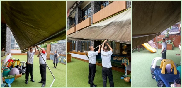 8月17日傍晚,一场突如其来的狂风暴雨席卷城市,强风过后,街区暖房子幼儿托育中心门前的遮雨棚遭到严重损坏,支架扭曲变形,防雨布被大风撕裂,残破不堪。考虑到孩子们早晨就要来园,破损的雨棚不仅无法使用,碎裂的支架和金属边角更可能带来安全隐患。托育中心的负责人李老师心急如焚,立即联系物业求助。