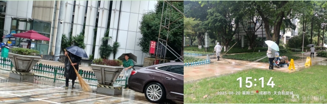 豆大的雨点不断地打在地面上,溅起一朵朵水花,但大姐们依然专注地工作着。她们的衣服很快就被雨水湿透了,紧紧地贴在身上,但她们丝毫不在意。她们的双手在雨水中冻得有些发红,却依然有力地握着清洁工具。