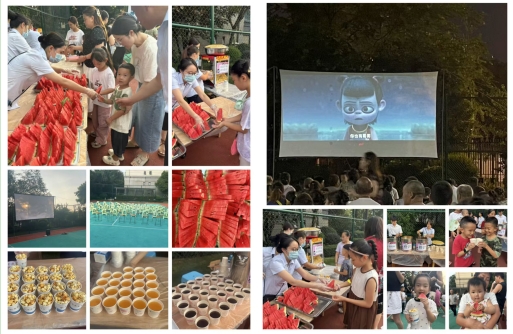 暮色刚漫过小区的树梢,小区网球场内就传来了此起彼伏的动静。物业工作人员忙碌而有序地布置着现场。搬运物资、配置桌椅、调整设备、贴心布线……很快,坝坝电影场地的雏形就形成了。一张白色的幕布缓缓升起,边角被绳子轻轻拽着,风一吹就微微鼓荡,像一块等待绘满故事的画布。业主们纷纷走出家门,或是一家老小,或是三两好友,脸上洋溢着兴奋与期待。因为正值高温天气,物业精心为业主们准备了观影拍档爆米花、小零食、西瓜、果汁、酸梅汤。孩子们更是兴奋不已,吃着最爱的爆米花和小零食,他们穿梭在人群中,嬉戏打闹,为这静谧的夜晚增添了几分生机与活力。