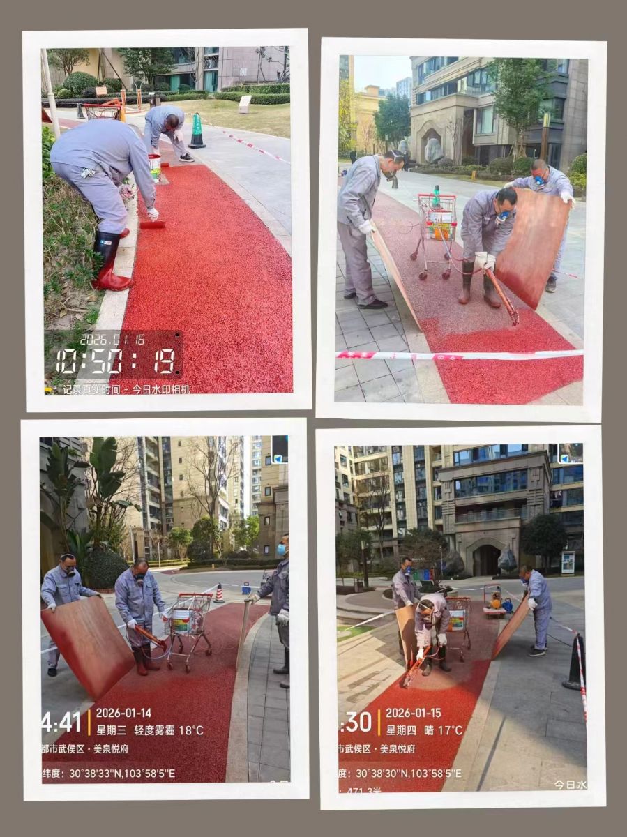 工程部特意选择了业主出行较少的时段施工,拉起安全警示带,摆放温馨提示牌,一遍遍提醒过往的业主绕行避让,生怕施工影响到大家的正常生活。看着工程师傅们手持滚筒,一点点将陈旧的跑道覆盖上鲜亮饱满的红色,看着原本灰暗磨损的路面慢慢变得平整光洁,我们的心里也满是期待。